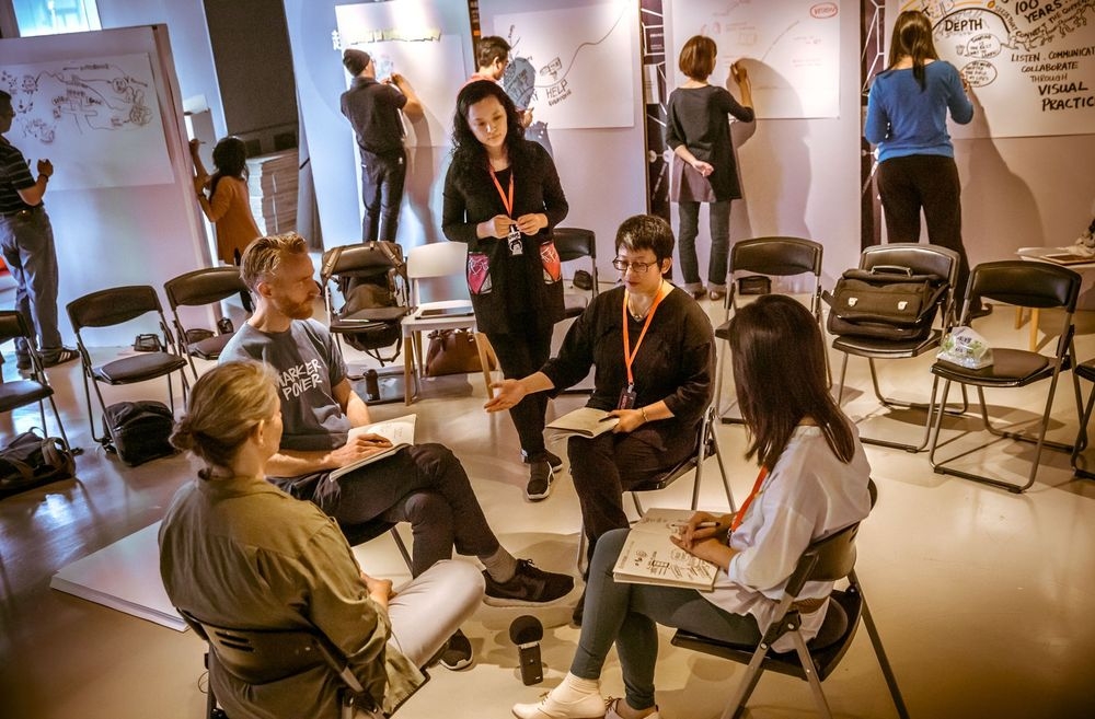 Scribing (also known as graphic recording / facilitation) is a practice where an artist maps out ideas while people talk. The drawing establishes connections within content, aids with insight, and supports decision-making. It facilitates group learning and cultural memory, and is embraced around the world as a popular social art and meeting tool.