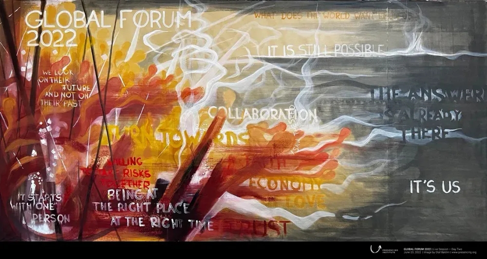 Visual Sensemaking is a method that uses two-dimensional language to “unpack” a current condition, inquire into its complexity, connect with source through presencing, and reveal an emergent, more coherent, possible future.